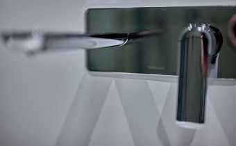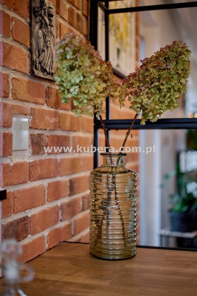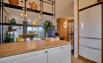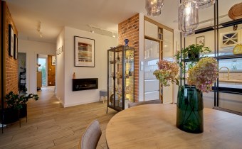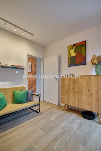 Przedsionek (2,48 m2) z zabudowaną szafą robioną na wymiar oraz lustro. Całość utrzymana jest w spójnym, eleganckim stylu. Wnętrze zdobią ozdobne lamele, cegła oraz starannie dobrane oświetlenie.