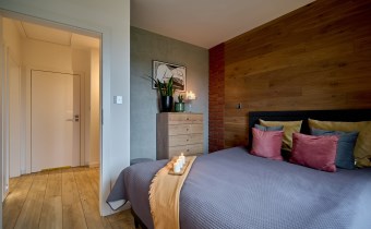 Sypialnia główna (10,10 m2)z wyjściem na ogród, tapicerowanym wezgłowiem i ścianą wykończoną naturalnym drewnem olejowanym oraz cegłą,