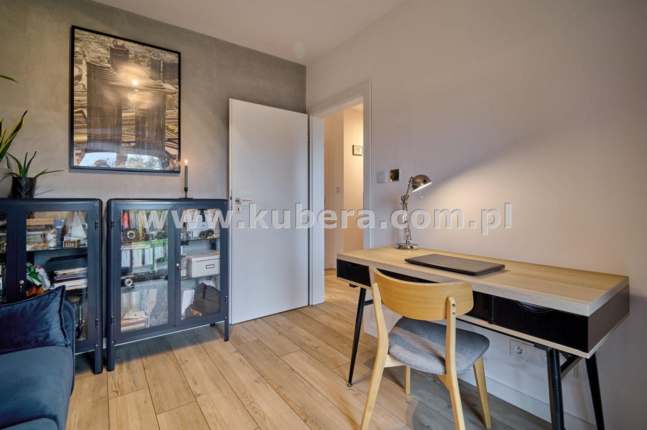 Gabinet (10,20 m2) z wyjściem na ogród, wyposażony w biurko, kanapę, szafki wiszące i oświetlenie,