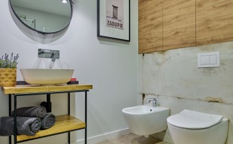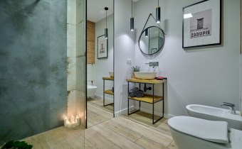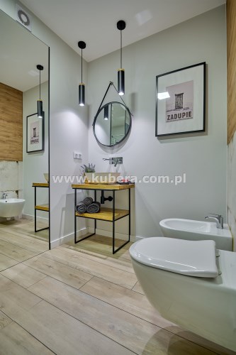 Stylowa łazienka (5,97 m2) z prysznicem typu walk-in, bateriami podtynkowymi, kompaktem WC, bidetem, umywalką i eleganckim oświetleniem, lustrem pionowym ściennym oraz wiszącym okrągłym nad umywalką