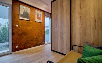 Pokój gościnny/garderoba (13,66 m2) z dwiema pojemnymi szafami i dekoracyjną ścianą w stylu loftowym - rdzawa
