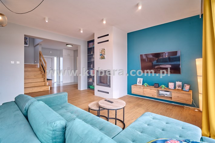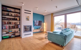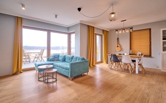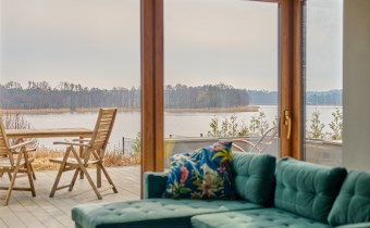 - Salon (ok. 31 m²): serce domu z klimatycznym kominkiem. Dwa niezależne wyjścia prowadzą na taras, z którego rozpościera się panoramiczny widok na Jezioro Więcborskie. To idealne miejsce na poranną kawę.