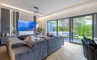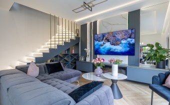 • ponad 35,00 m² pokoju dziennego z jadalnią z bezpośrednim wyjściem na taras – idealne miejsce na rodzinne spotkania i przyjęcia. Wykończona naturalnym kamieniem ściana RTV idealnie komponuje się z podświetlanymi kamiennymi schodami.