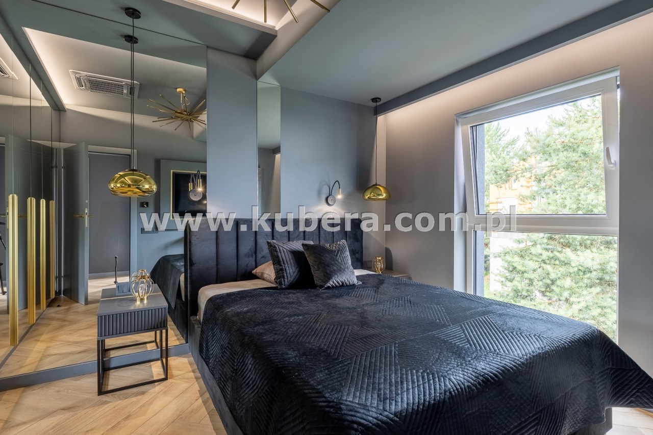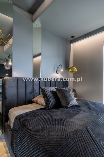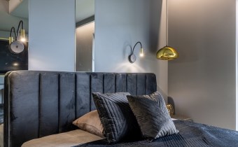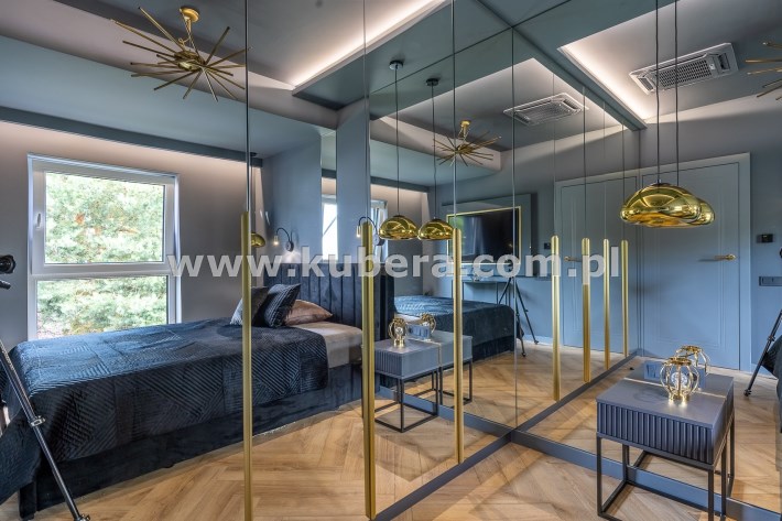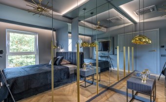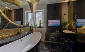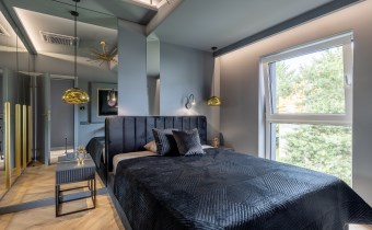 • Wyrafinowana sypialnia – wykończona w czerni i złocie z dużą oszkloną szafą.