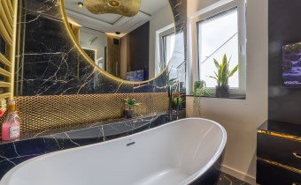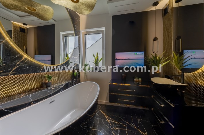 • Łazienka z wanną i TV: Relaks w luksusowej odsłonie, z możliwością oglądania ulubionych programów podczas kąpieli.