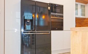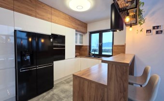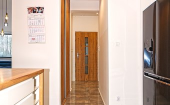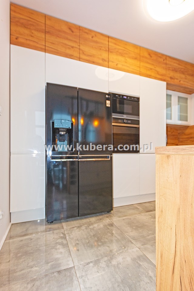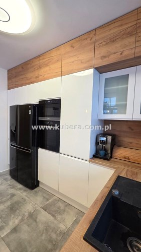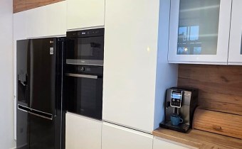 Kuchnia, elegancka i funkcjonalna (mnóstwo miejsca na przechowywanie), wykonana na zamówienie, naturalnie łączy się z jadalnią. Nowoczesna zabudowa w przytulnej kolorystyce i wysokiej klasy sprzęt AGD sprawiają, że gotowanie staje się przyjemnością, a codzienność — wygodą. W cenę wliczona jest całe umeblowanie i wyposażenie kuchni.
