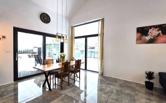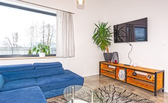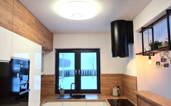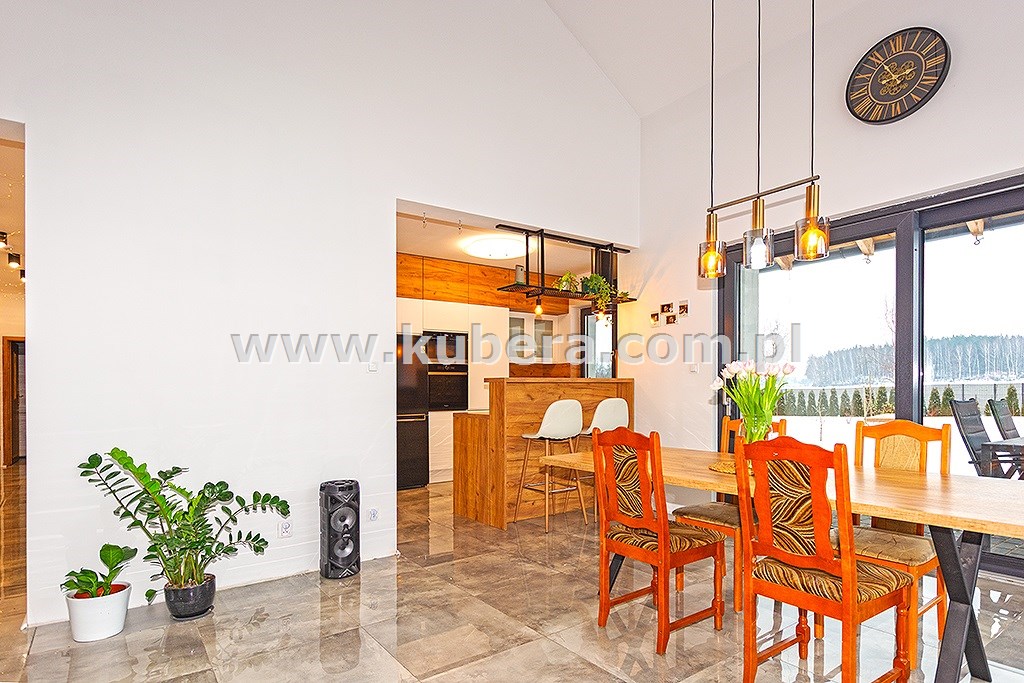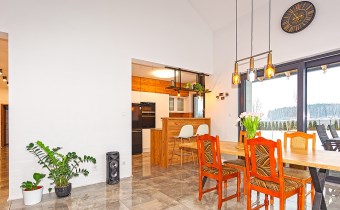 Sercem domu jest imponujący salon z jadalnią o powierzchni ponad 30m2– wysoki na 4,53 m, wypełniony światłem wpadającym przez duże przeszklenia i panoramiczne, dwuskrzydłowe okno HST prowadzące wprost na wypolbrukowany taras. To przestrzeń stworzona do wspólnych chwil: poranków z kawą, rodzinnych obiadów i wieczorów przy kominku, gdy dom wypełnia ciepło i spokój. W cenie jest osprzęt: czyli kominek oraz przygotowane instalacje (nawiew i komin spalinowy).