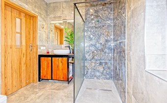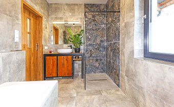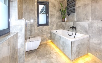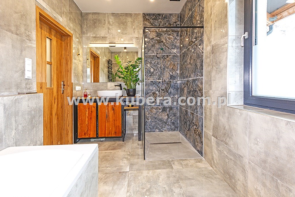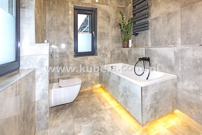 Łazienka została zaprojektowana z myślą o komforcie i relaksie – wanna, nowoczesny prysznic z odpływem liniowym, dwa okna.