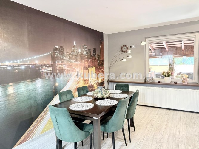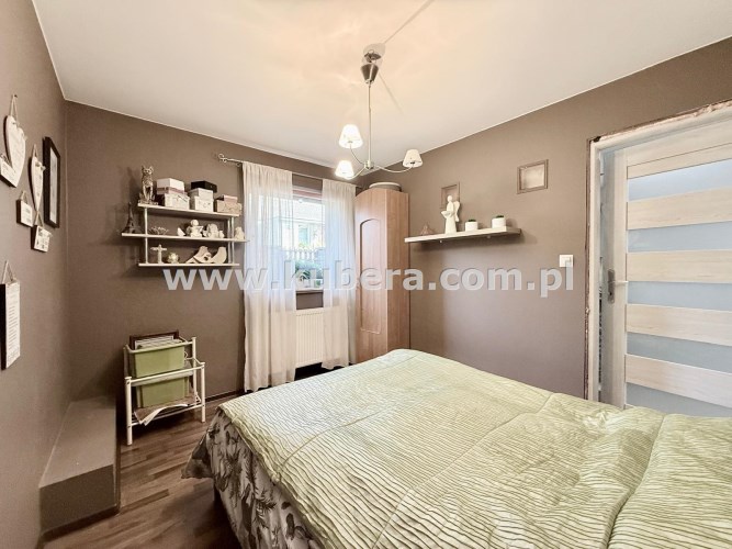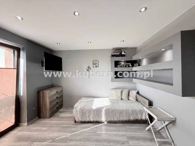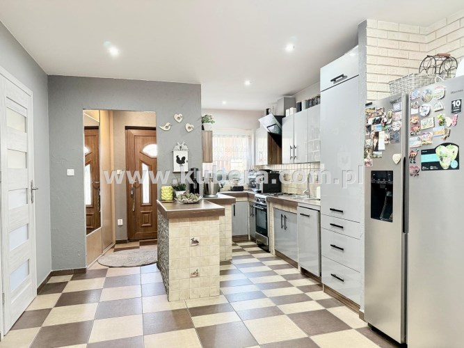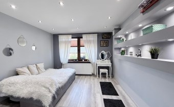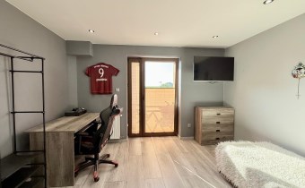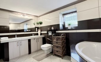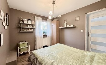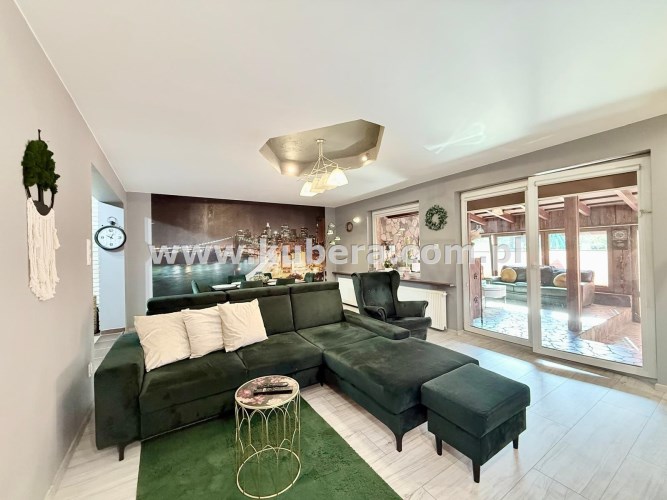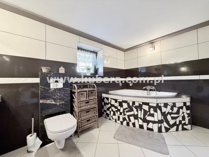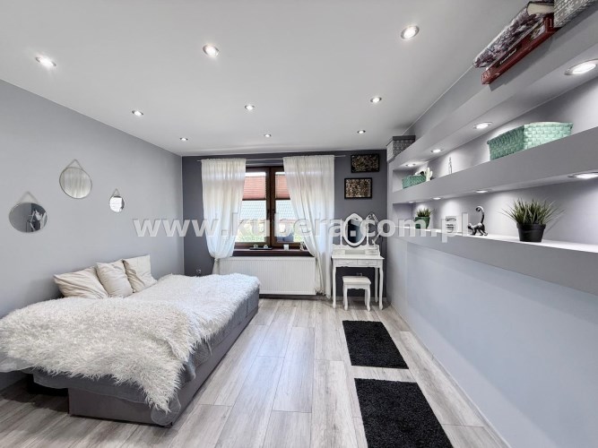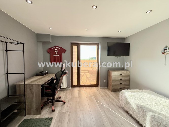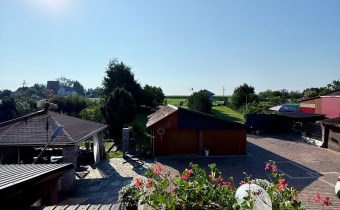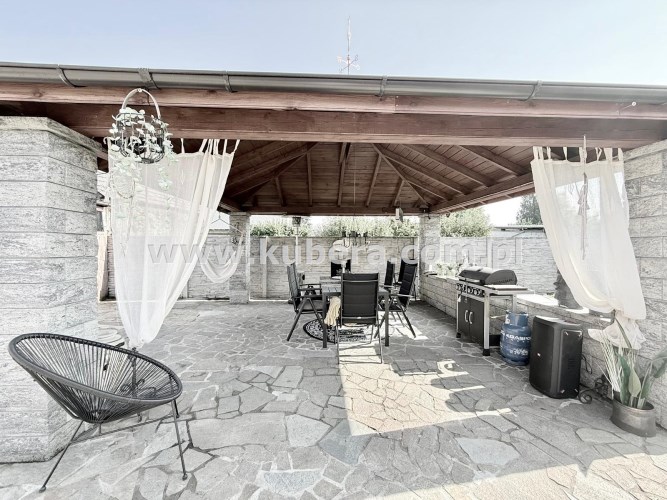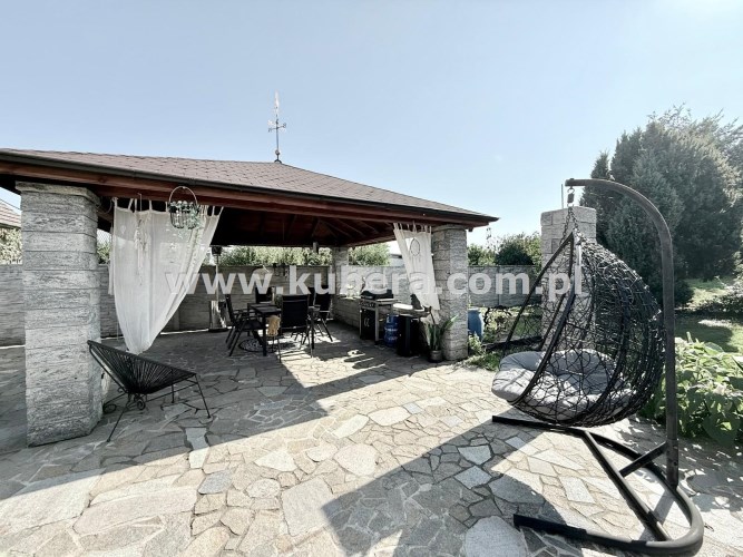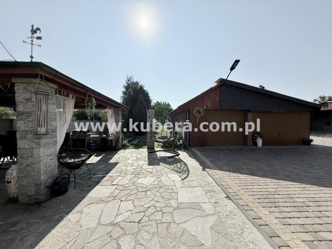 Z salonu wyjście na zabudowaną werandę/taras - idealne miejsce na spotkania w gronie znajomych. Na parterze domu znajdziemy sypialnię i urządzoną siłownię. Łazienka z oknem - wanną i prysznicem oraz pojemną szafą, która pomieści wszystko, co w łazience niezbędne. Oddzielnie wc. Na piętrze znajdziemy dwie przytulne sypialnie, a z jednej z nich piękny widok na beztroskość i sielskość przyrody. Bonusem domu jest kawalerka o powierzchni 45 m2 z oddzielnym wejściem. Może być idealnym miejscem dla przyjezdnych rodziców, dorastającego nastolatka :) czy też na oddzielne miejsce dla działalności gospodarczej. Dla lubiących majsterkowanie dom oferuje przestronny warsztat wielkości około 44 m2- tu każdy majsterkowicz znajdzie swój kawałek przestrzeni :). Jest również kotłownia. Na zabudowanym tarasie znajdziemy miejsce do biesiadowania ze stołem, krzesłami i grillem. Na posesji znajdziemy dwa garaże, budynek gospodarczy i kojec dla psiaka . W drugiej części działki mamy przygotowane miejsce na postawienie basenu. Kochający własne uprawy znajdą miejsce na niejedną grządkę czy też szklarnię.