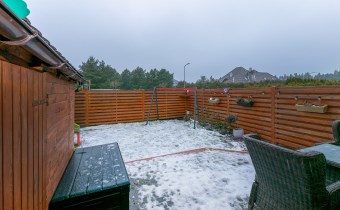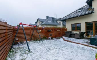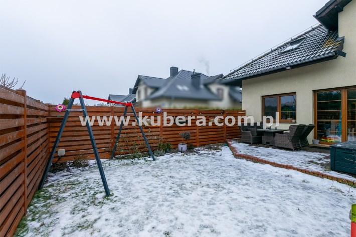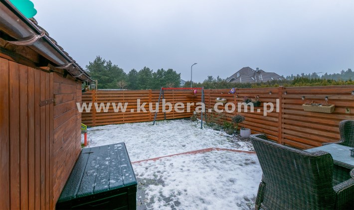 Z salonu możemy skierować się na ogród o powierzchni 75 m2 jest, który jest ogrodzony ogrodzeniem panelowym wykonanym ze świerku, z osobnym wejściem z podjazdu na szerokość jednego panela, co ułatwia przenoszenie gabarytowych przedmiotów. Oświetlenie ogrodu na pilota.