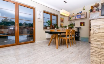 Salon z aneksem kuchennym i jadalnią ma 34,78 m2. Poza zabudową kuchenną i rodzinnym stołem jadalnianym znajduje się tu kominek, posiadający zarówno tą podstawową funkcję czyli niesamowity klimat ale również funkcję grzania domu (również na piętrze). Ściany w kuchni wykończone glinką wenecką.