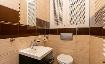 WC ze zlewem na poziomie parteru sprawdza się w codzienności i to jest 2,05 m2 z praktyczną zabudową nad stelażem.