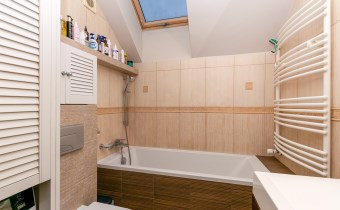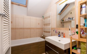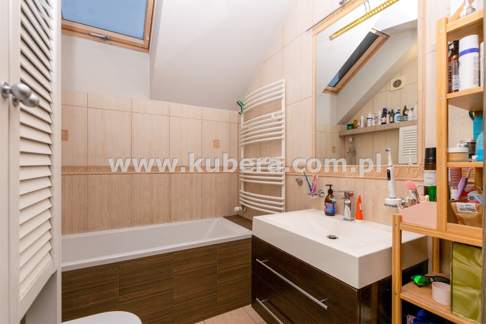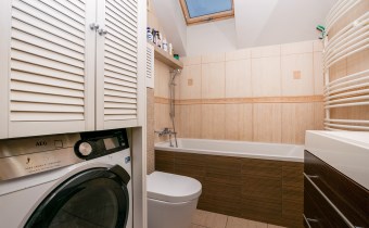 jak również pralko-suszarkę z pompą ciepła firmy AEG (ma 2 lata), a nad nią znajduje się kocioł gazowy dwufunkcyjny z zamkniętą komorą spalania. Dlatego może być zabudowany półkami tak jak to uczynili właściciele dając sobie kolejną przestrzeń do przechowywania. Łazienka jest widna – z oknem połaciowym.