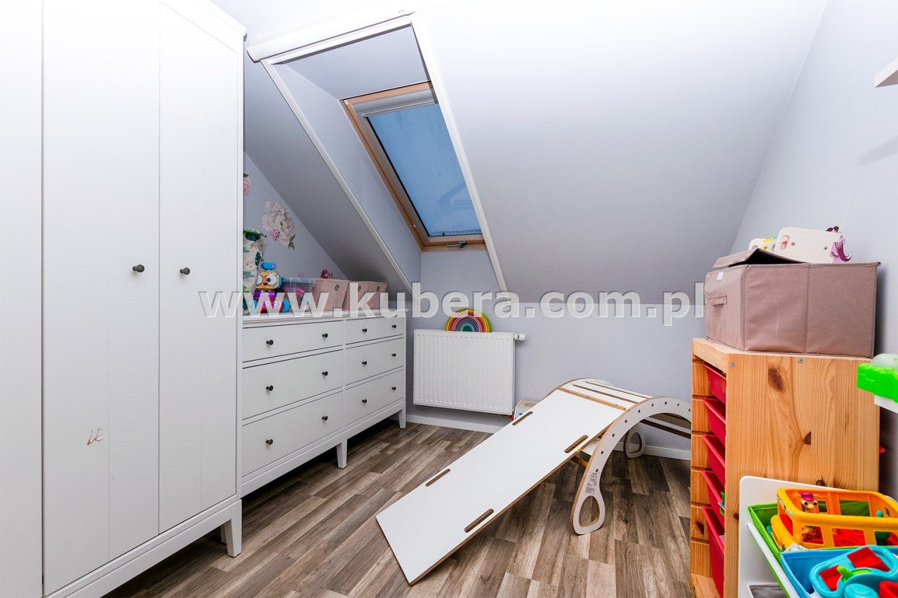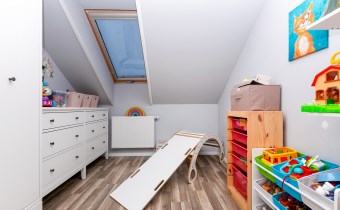 Jak już o tym mowa, to warto zaznaczyć, że korytarz na piętrze (pow. 5m2) jest bardzo foremny z dobrym układem i dlatego właściciele umieścili w nim szafę jak również biurko/toaletkę. Stąd też jest wejście na strych (właz strychowy z opuszczanymi schodami). Strych może być wykorzystywany jako gospodarcza przestrzeń ponieważ wykonana jest tu podłoga z płyty OSB oraz zadbano o oświetlenie.