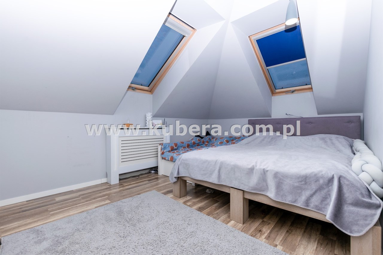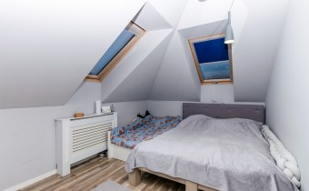 Trzy niezależne sypialnie (10m2, 9,12m2, 8m2) w tym jedna z garderobą o powierzchni 3m2. Dwie sypialnie oraz łazienka posiadają skosy dlatego powierzchnia przypodłogowa jest większa niż powierzchnia użytkowa domu. Okna połaciowe/dachowe firmy FACRO wyposażone są w zewnętrzne rolety przeciwsłoneczne oraz dodatkowe wewnętrzne. Na całej przestrzeni piętra podłogi posiadają jednolitą i  bez progów powierzchnię, wyłożoną bardzo dobrej jakości panelami.