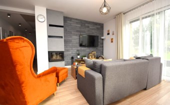 Salon o pow. 31 m2- przepięknie doświetlony dużymi oknami tarasowymi, z wyjściem na kameralny taras od strony ogrodu, z kominkiem.