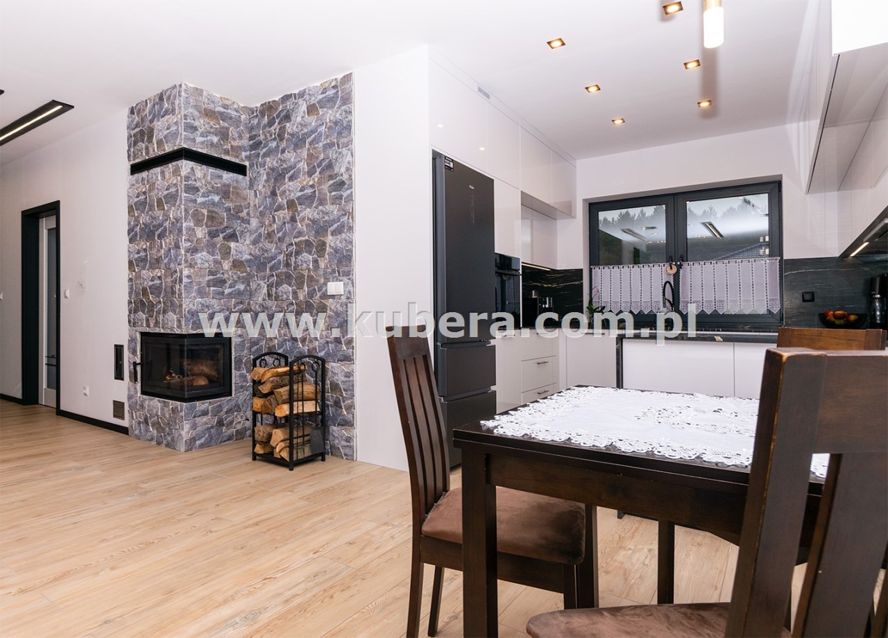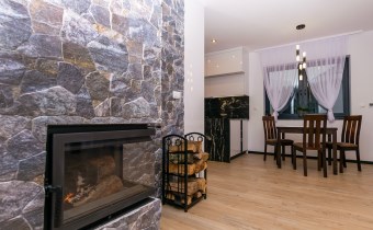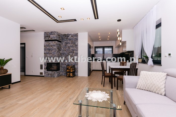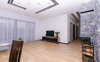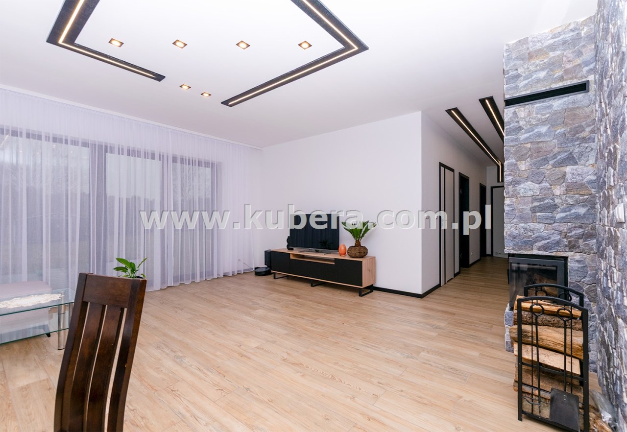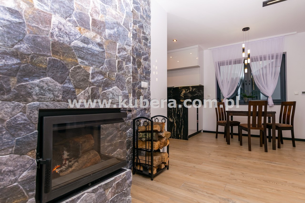• salon z jadalnią (28,92 m2) wyposażony w kominek narożny (kratki.pl) z rozprowadzeniem grawitacyjnym ciepła na 3 pokoje, obłożony wysokiej klasy kamieniem betonowym, duże 4 skrzydłowe okno prowadzące na taras (2 skrzydła uchylno-rozwiewne, 2 stałe),
