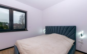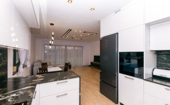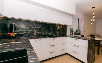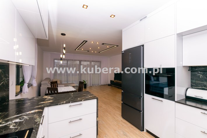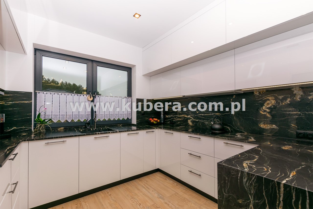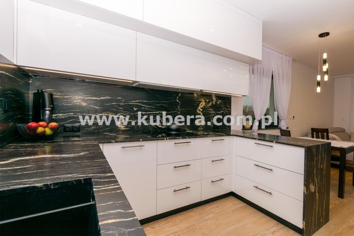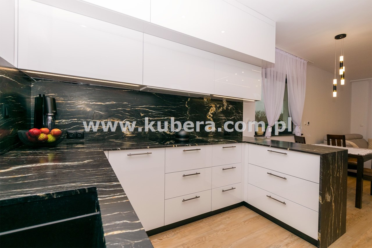• przestronna kuchnia (9,16 m2) w zabudowie wraz z wysokiej jakości sprzętem AGD (płyta indukcyjna Indesit, pochłaniacz, zmywarka Bosch, piekarnik Haier, Lodówko-zamrażalka Haier), blaty granitowe, fronty wysoki połysk białe akryl, zlew granitowy podwieszany, bateria Deante z magnetyczną elastyczną wylewką, oświetlenie leedowe dotykowe z możliwością ściemniania,