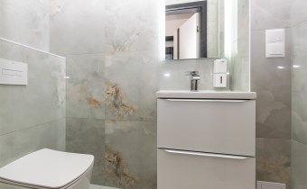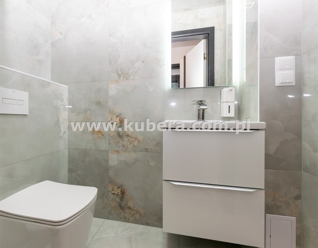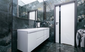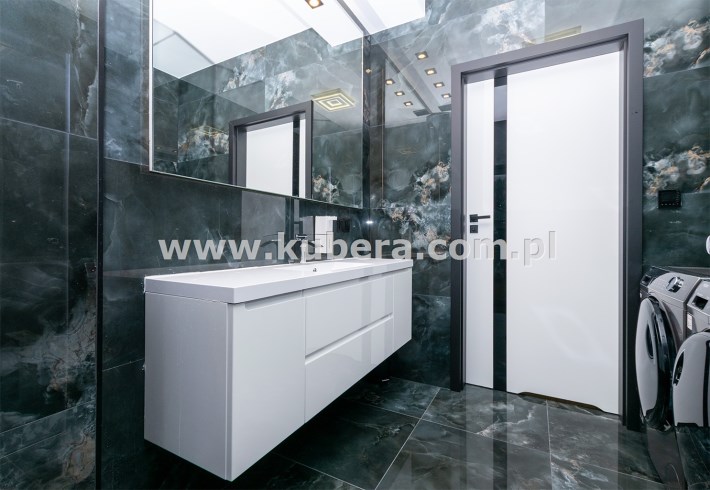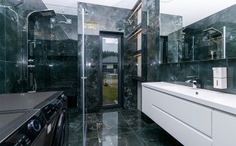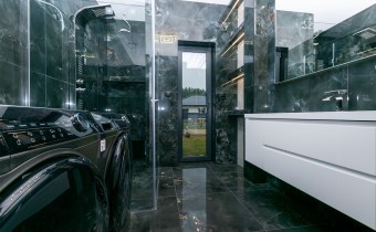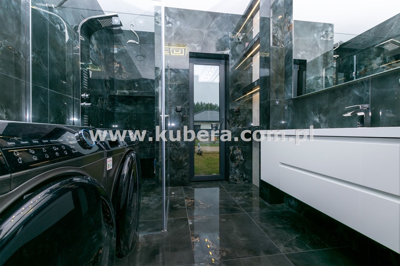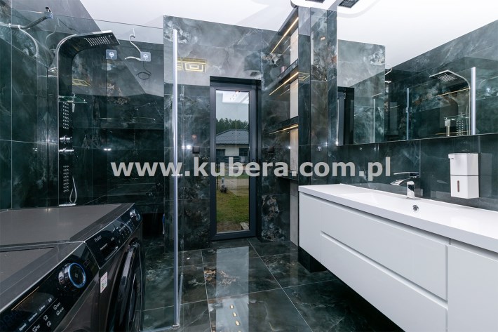 • łazienka (6,58 m2) wyposażona w prysznic ze szkła 8 mm z powłoką hydrofobową o wymiarach 120x100 z odpływem liniowym wraz panelem prysznicowym i deszczownicą Brise, podświetlane lustro i półki, w cenie pralka i suszarka Haier,