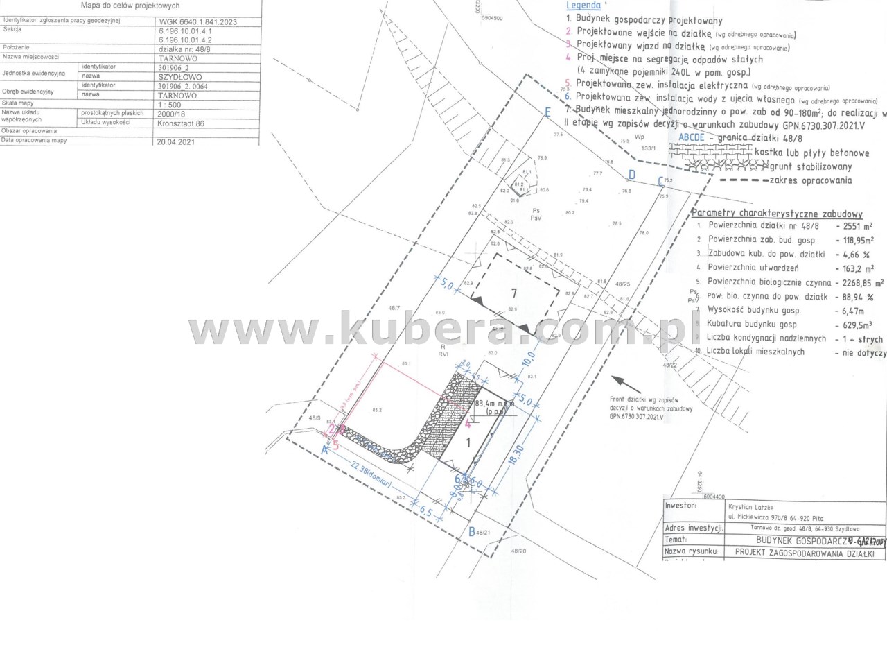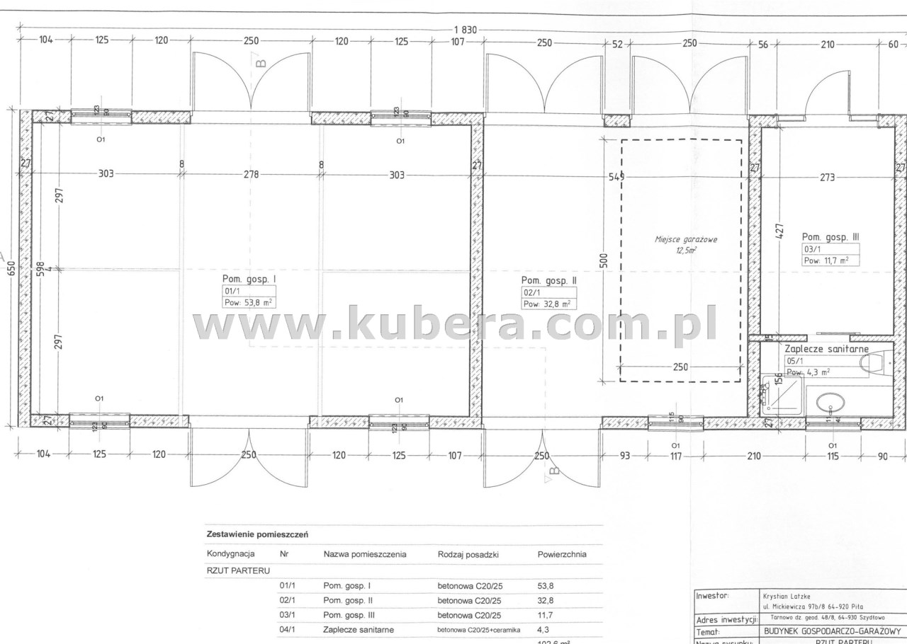 - Na działce rozpoczęto inwestycję budowy budynku gospodarczo-garażowego w stanie surowym otwartym (bez dachu) o łącznej powierzchni użytkowej 102,6 m², obejmującej: