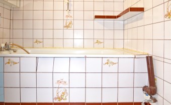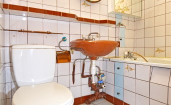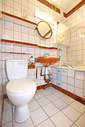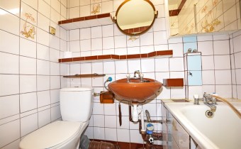 - łazienka z wc, wanną, zlewem i lustrem,