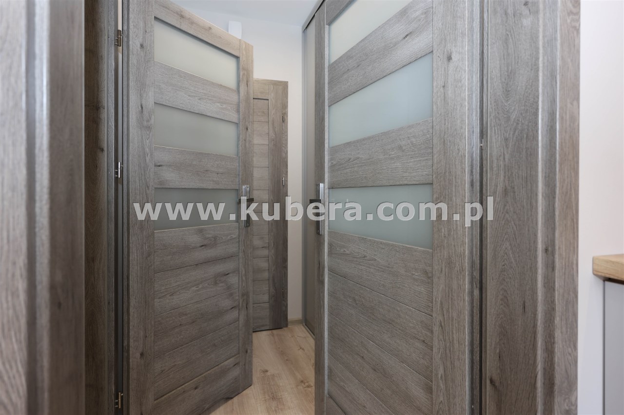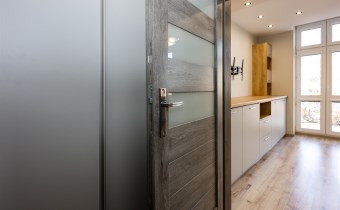 korytarz oddzielony drzwiami, z dużą szafą w zabudowie, oferującą sporo miejsca do przechowywania,