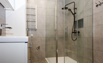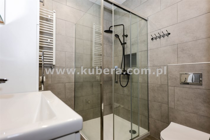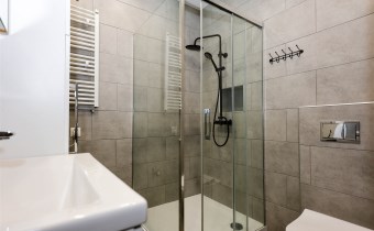 przestronna łazienka z prysznicem i WC, wykończona w nowoczesnym stylu,