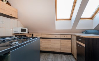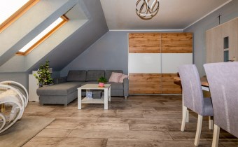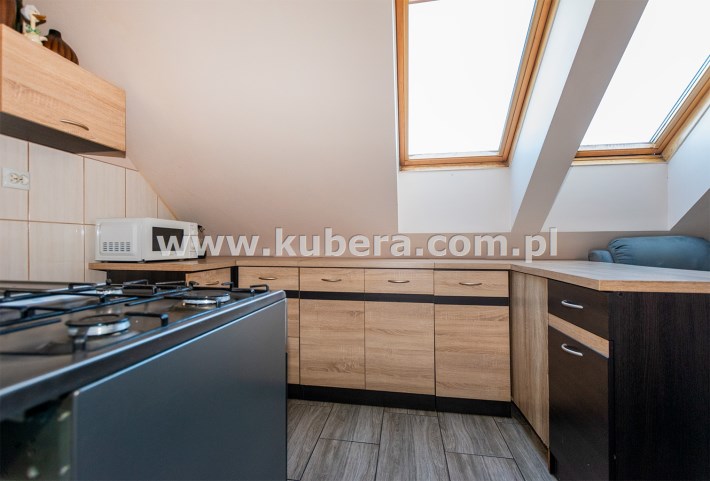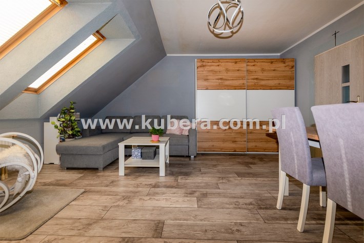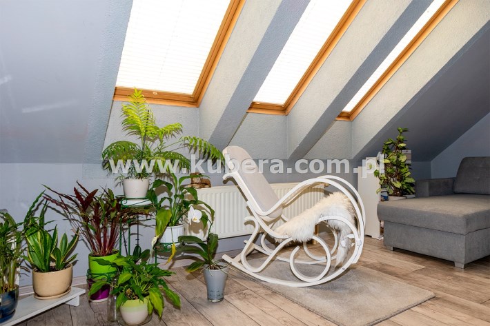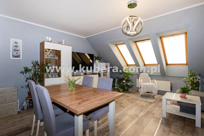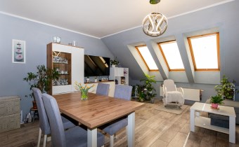 Mieszkanie posiada okna połaciowe, które dobrze doświetlają wnętrze i nadają mu przytulny charakter.