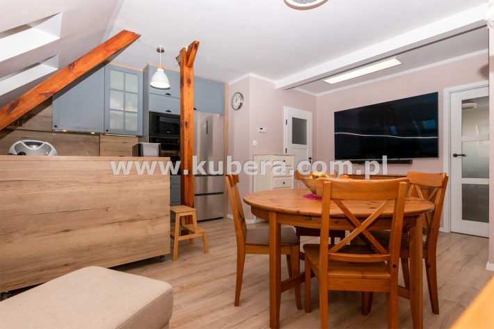 • przestronny salon z aneksem kuchennym, który jest oddzielony wyspą kuchenną z sześcioma szufladami. Kuchnia posiada meble w zabudowie oraz niezbędny sprzęt AGD (płyta indukcyjna Samsung, pochłaniacz MPM, piekarnik dual cook Samsung, mikrofalówka Samsung, lodówka Heier, zmywarka 45 cm Hotpoint Ariston),