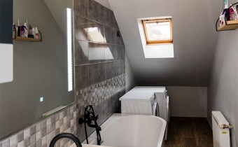 • łazienka z WC wyposażona w wannę, umywalkę, szafkę pod umywalką, podświetlane lustro, WC.