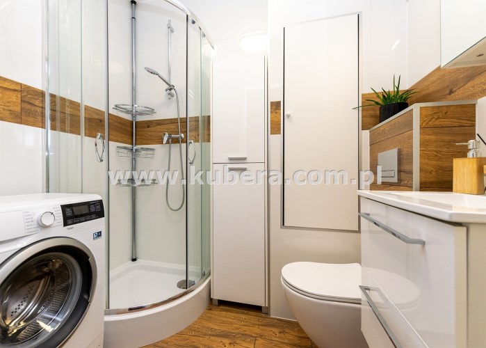 Wyposażenie łazienki lustro, pralka, prysznic, umywalka, WC