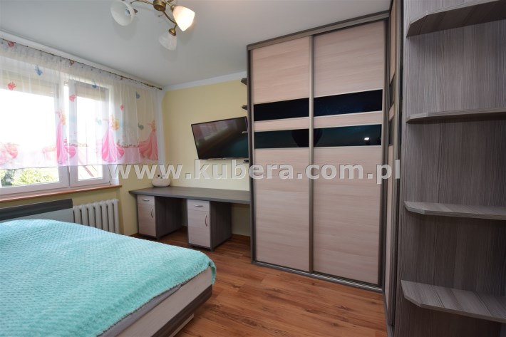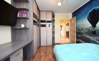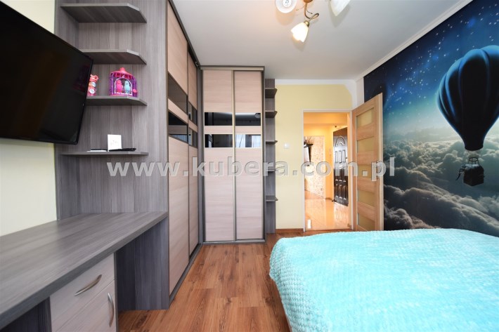- sypialnia o pow. 12,3 m² z łóżkiem dwuosobowym, szafą typu komandor i biurkiem robionymi na wymiar