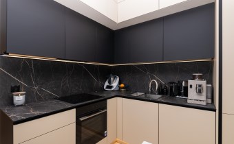 • Kuchnia wyposażona wysokiej jakości sprzęt AGD firmy Bosch (płyta indukcyjna, lodówko-zamrażalka szerokości 70cm, piekarnik z funkcją Airfryer, pochłaniacz,  młynek na odpady firmy TEKA), meble na wymiar z frontami antyfinger firmy RARO,  blaty kuchenne z konglomeratu firmy RARO, elegancji rozkładany stół ceramiczny wraz z krzesłami.