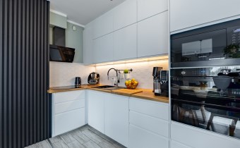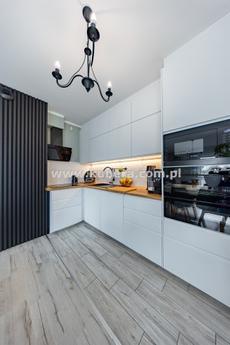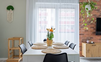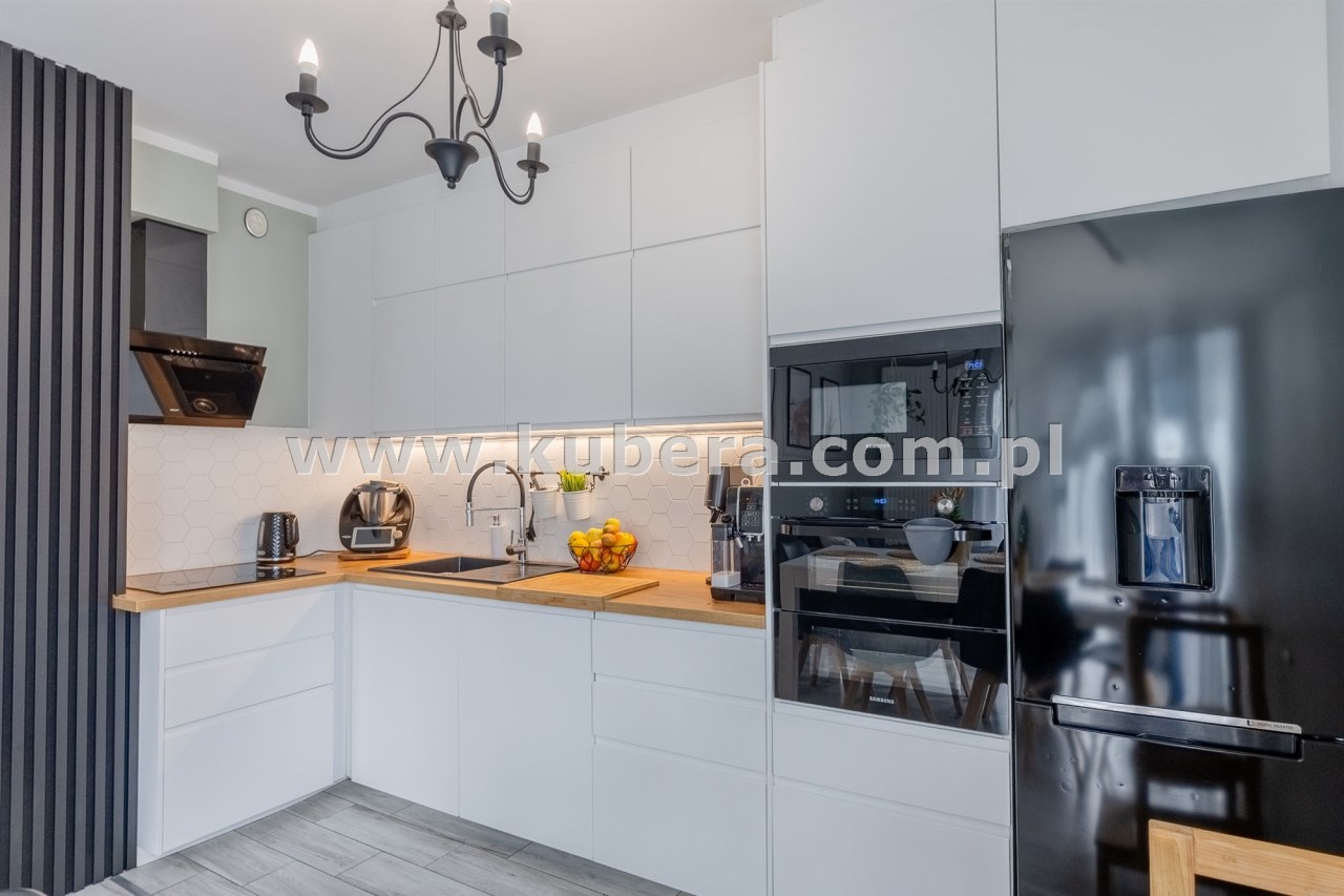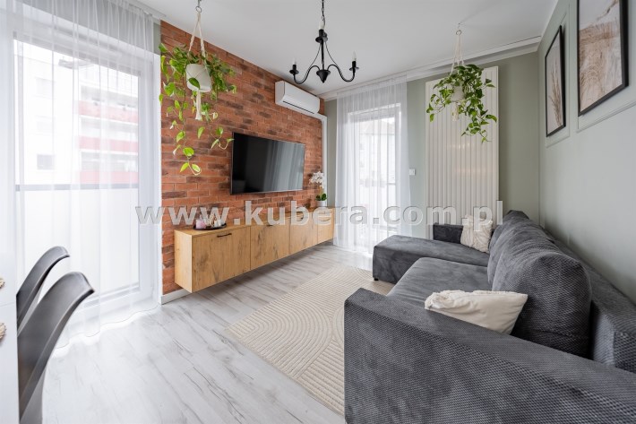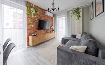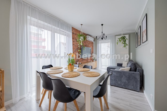 - Przestronny Salon z Aneksem Kuchennym (pow. 21,8 m2): Serce domu to funkcjonalny salon z otwartym aneksem, wyposażonym w nowoczesną zabudowę kuchenną i wysokiej klasy sprzęt AGD. Elementy takie jak designerska sztukateria na ścianach oraz dekoracyjna cegła nadają wnętrzu niepowtarzalny charakter, łącząc eklektyczny styl z domowym ciepłem. W salonie zainstalowano klimatyzację, gwarantując komfort w upalne dni.