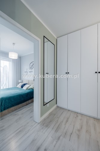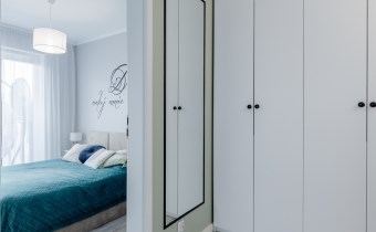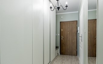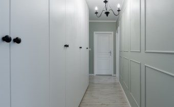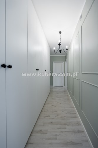 - Świetnie Wykorzystana Przestrzeń: Cała powierzchnia korytarza została efektywnie wykorzystana pod zabudowę w pojemne szafy. To świetnie rozwiązana przestrzeń do przechowywania, dzięki której nie ma konieczności stawiania szaf w pokojach, co pozwala na maksymalne wykorzystanie ich przestrzeni i swobodę aranżacji.