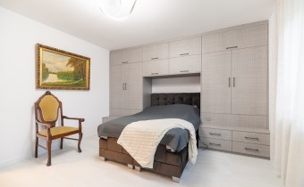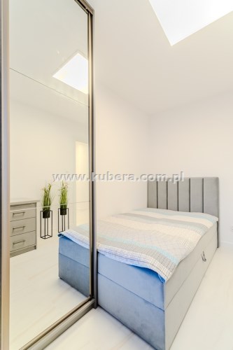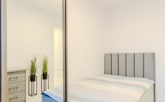 W głębi apartamentu znajdują się dwie bliźniacze pokoje i główna sypialnia z podwójnym łóżkiem oraz zabudową meblową na całej ścianie.