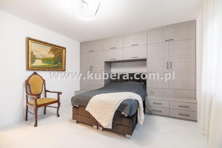 Drugie wyjście z salonu prowadzi do osobnego pokoju z dużą, zabudowaną szafą typu Komandor.