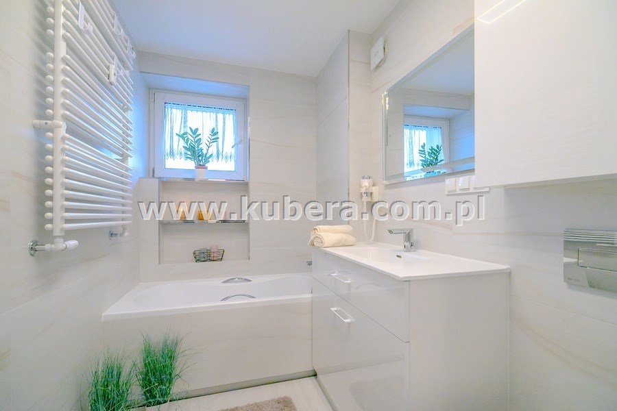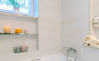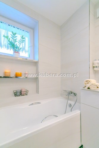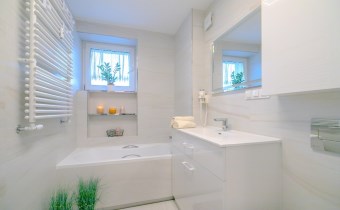 W urządzonej w jasnej tonacji łazience, do wyboru mieszkańców znajduje się zarówno wanna jak i prysznic, z wysokiej klasy armaturą.