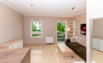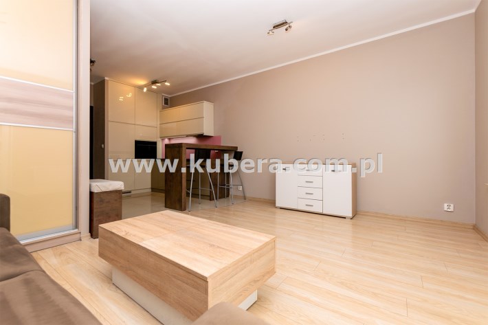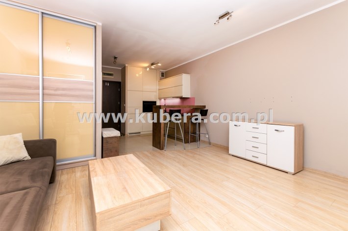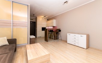 - salon z aneksem kuchennym i wyjściem na balkon o pow. 25,77 m2 (balkon o pow. około 2,3 m2), w tym w pełni wyposażona kuchnia ze sprzętem AGD (zmywarka, piekarnik, płyta indukcyjna, okap, lodówka),