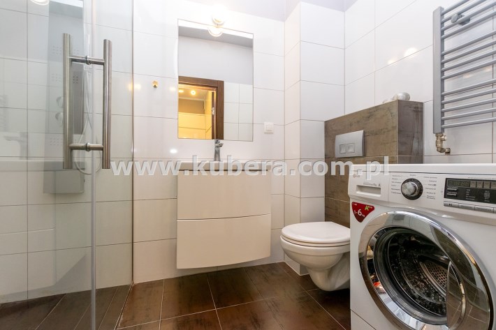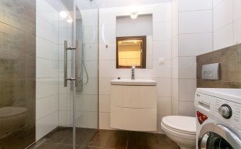 - łazienka o pow. 3,64 m2, wyposażona w umywalkę, lustro, pralkę i kabinę prysznicową.