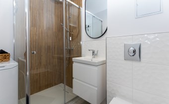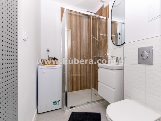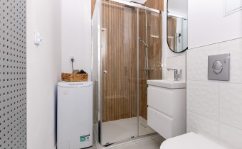 Wyposażenie łazienki kabina prysznicowa, lustro, pralka, umywalka, WC